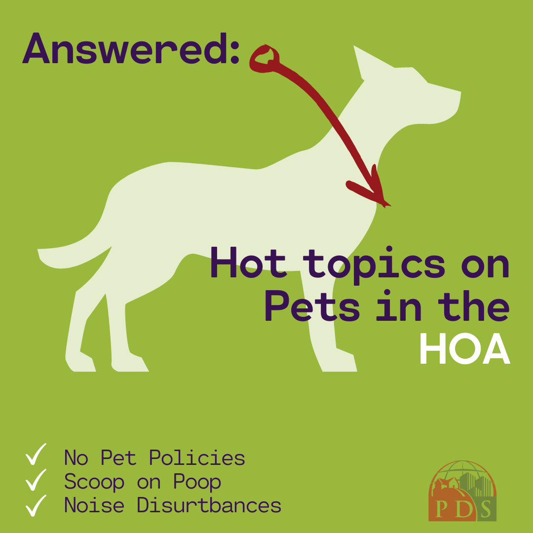 Pets in the HOA. Almost everyone has a pet, and almost everyone has an opinion on HOA Pet policies. We have taken the hottest topics on types pets in the HOA, pet policies, “scoop on poop,” and dealing noise disturbances from neighbors pets, and combined them into one article.